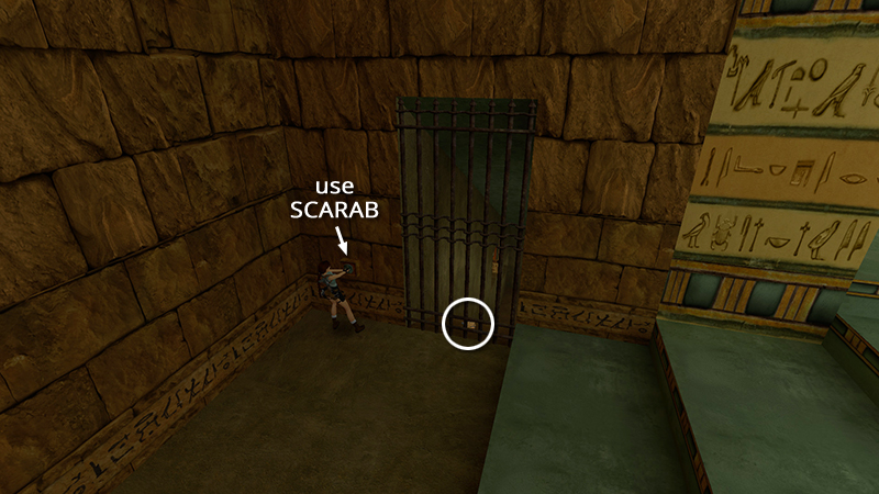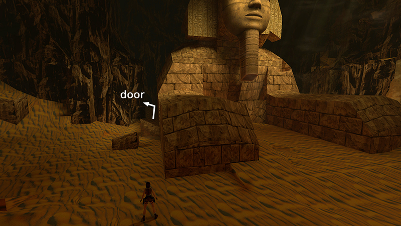 Afterwards, hop down onto the sphinx's paw and from there to the ground. Between the sphinx's paws are some magnum clips (5) and a closed door. Your next goal is is to open that door. Naturally, there's no doorknob. This is Tomb Raider, after all. We'll need to work for it. (screenshots)