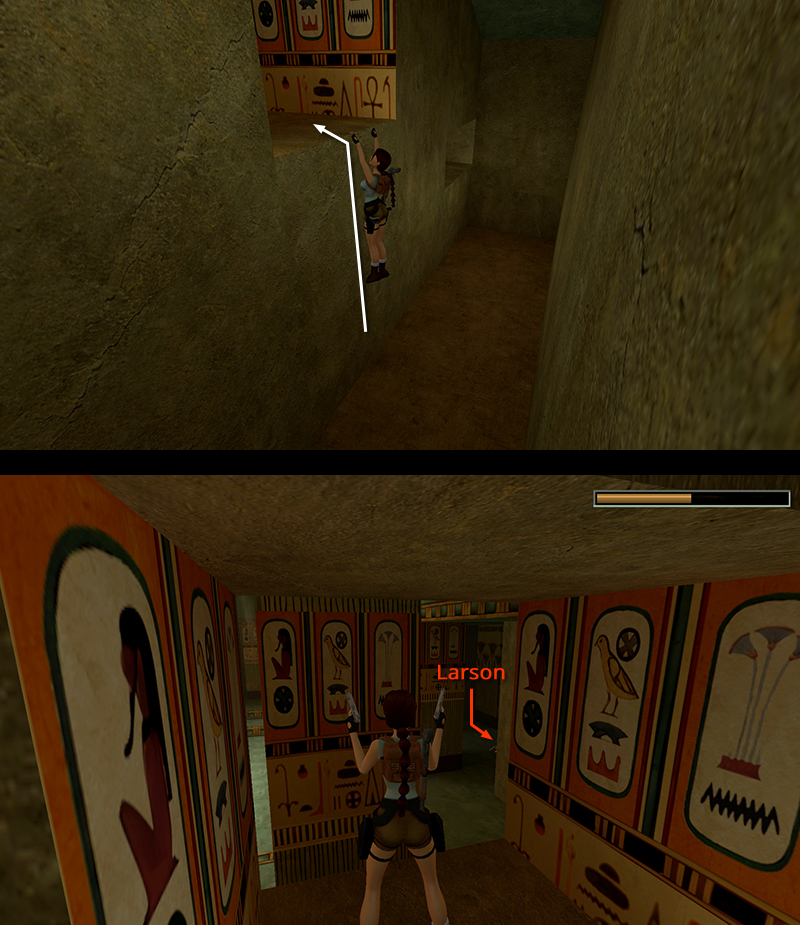 SCION ROOM: When you're ready to move on, place the SCARAB in the receptacle to open the left gate. Pick up the large medi pack and magnum clips (27-28), then slide down the sloping steps. (screenshot) Climb through the larger opening on the left and prepare to take on Larson (15) once again. (Apparently Lara only stunned him back in the Lost Valley.) He is lurking behind the pillars on the right but emerges spouting threats and lead as soon as Lara hits the ground. (screenshots)