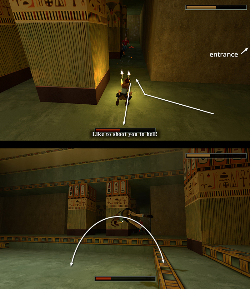 NOTE: While climbing on the sphinx, you'll probably notice some goodies off to the south, including what looks like guns floating in midair. (screenshot) Yes, that's exactly what they are, and we'll retrieve them shortly. If you're keen on retrieving them a.s.a.p., check the footnote.