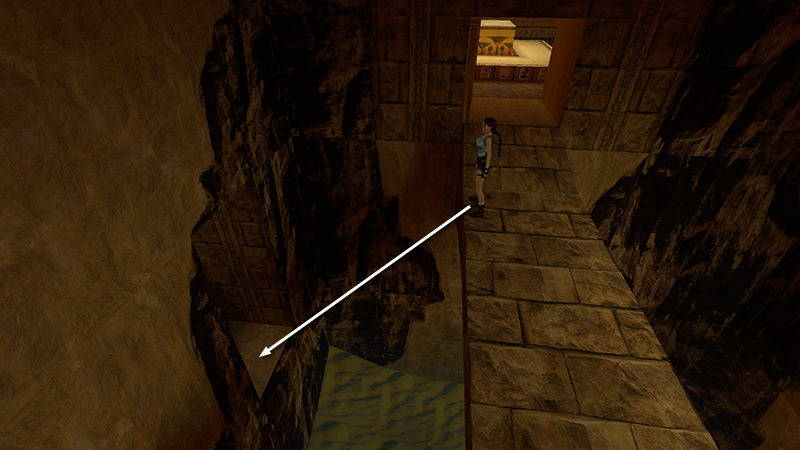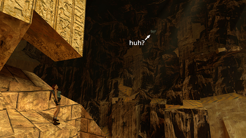 SECRET ON INVISIBLE PLATFORM: From here, you should be able to see a gold door high on the east cavern wall, behind the sphinx. This is the one you opened earlier using the first switch, and it's where you're headed next. But first, go after the level's only SECRET, the UZIS and some Uzi ammo (12-13). They're fairly easy to spot in the remastered game, floating off to the left on an invisible platform. (screenshot)