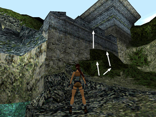 CAVE WITH POOL: The level begins in a cave at the base of the wall. As you cross the cavern floor, the camera shifts to show the helicopter moving away. The building above is where you're headed next. If you're new to Tomb Raider and are having trouble negotiating this climb, this series of screenshots may help. You might also want to review the TR2 Controls page and practice a bit in the safety of the Croft Manor training level.