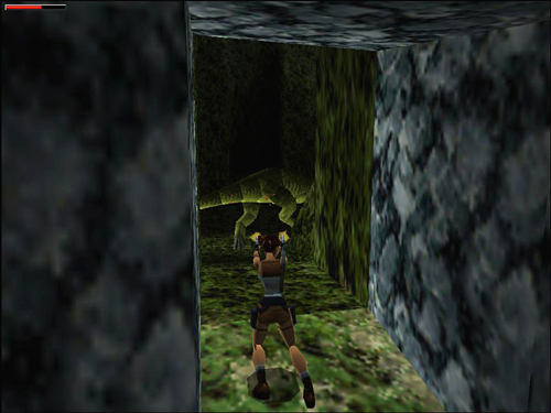 Enter the cavern and advance to the right, just as far as the two skeletons. You'll start to hear a rumbling in the distance. If you played the original Tomb Raider, you can probably guess what's coming. So either prepare to fight the Tyrannosaurus rex (20), or run back to the tunnel opening for some cover and plug away at him from there. If you hold down the Action button, Lara will remain locked on to her target even if he moves out of sight. Then she can run forward to get his attention and hop back into the safety of the tunnel whenever he approaches. (screenshot)