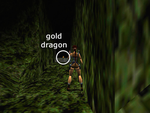 When Mr. Rex is dead, go back into the cavern and run past the skeletons all the way to the far end. Enter the dark passageway and retrieve SECRET #3, the Gold Dragon (10). (screenshot) If you've gotten all three secrets, you'll also receive a bonus of a small medi pack, 2 pairs of grenades and the GRENADE LAUNCHER (11-14) oaded with another 2 grenades. (You'll have other chances to acquire this weapon if you miss it here.)