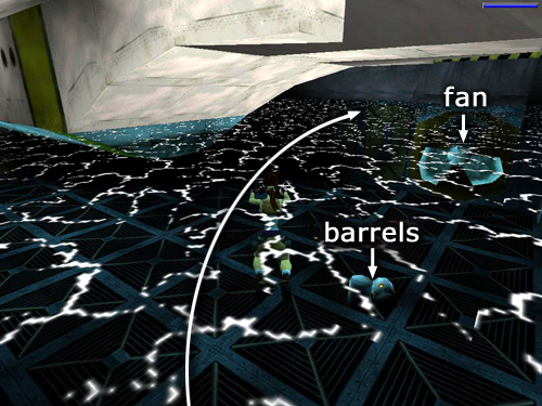 YELLOW CARD AND LOCK: Now you can swim back to the landing where you escaped from the room with all the crates. Come in from the right behind the wall, so the enemies don't see you before you see them. (screenshot) Climb out of the water and go through the door on your right, avoiding the ramp with the rolling barrels. Now that you have your guns back, you can take care of the 2 bad guys (1-2) and steal their large medi pack and YELLOW PASS CARD (3-4).