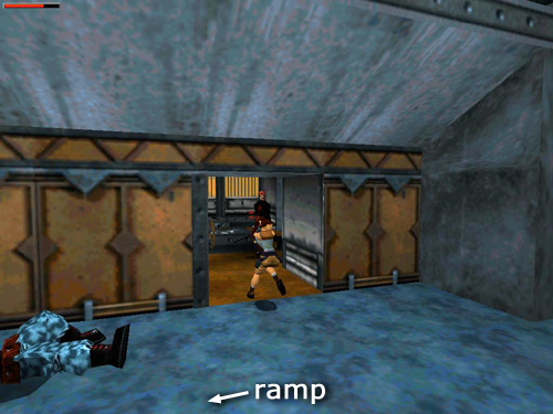 ROOM WITH RAMP AND METAL LEDGES: If you rush into the next room, Lara will be ambushed by 3 more rig workers (9-11). But if you proceed with caution, you can take them out one at a time. First, draw pistols and step into the doorway without going any farther. Lara will target the enemy on the catwalk (9) to the left so you can shoot him without taking any damage or triggering the other enemies. Then enter the room and immediately take a running jump across the shallow pit on the left to land on the catwalk. An alarm starts blaring, but there's nothing you can do about it, so just go on about your business. Two bad guys with clubs (10-11) appear, one materializes inside the room, one comes in from the hallway. Although they can climb onto the other metal ledges in this room, they can't reach Lara here. Take your time and use pistols so you don't waste ammo. Afterward, loot the bodies for a small medi pack, flares, and shotgun shells (19-21). (screenshots)