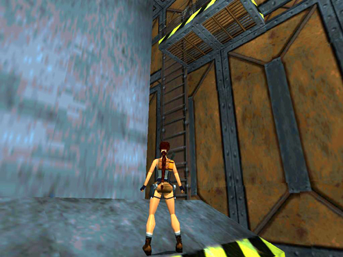 NOTE: Save frequently during this next sequence since it's easy to miss a jump or accidentally step off a ledge. If you fall into the pool and don't want to reload, there's a ladder in the far left corner (relative to the long chute where you came in). Swim over there, climb out of the water onto the cement footing and jump to grab the ladder. (screenshot) Climb back up to the catwalks and continue.