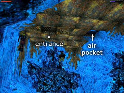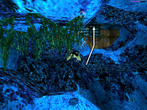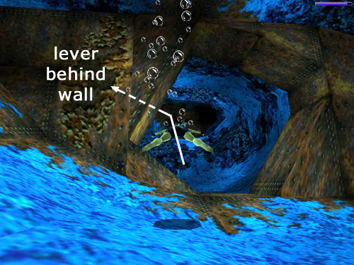 SEAFLOOR: You begin underwater where you left off a moment ago. Swim through the metal arch and around to the left. Pull the lever on the wall beside the archway (screenshot) to open a trapdoor in the ship's hull. Roll and swim away from the lever and up through the trapdoor. (screenshot)