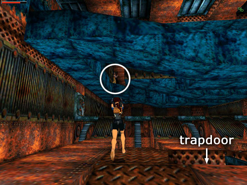 FLOODED BURNER ROOM: Now that it's underwater, you can reach the lever just inside on the right (i.e., above and to the left of the entrance if you turn around to face it). (screenshot) If you need air, head for the opening in the ceiling of the little room to the left of the lever (i.e., above the switch you pulled to turn off the burners). Fill Lara's air meter then swim back into the burner room and straight across to the door you just opened. Otherwise, immediately after pulling the lever, roll and swim through the door and down through an opening in the floor.