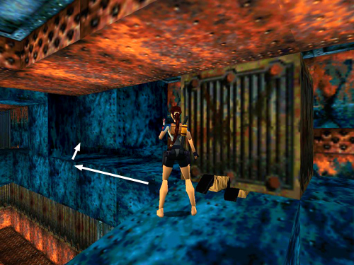 Lara can safety drop to the floor from this ledge if she has full health. To get down without injury, take a running jump to the fourth piston, which is now lower than it was before. Then safety drop to the angled surface below and slide down to the floor. Follow the rusty passageway back toward the BURNER ROOM. The part of the passageway where you killed the bad guys before is now flooded. Hop into the water and swim into the room.