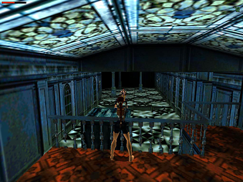 THEATRE LOBBY: Enter this garishly decorated room and kill the goon with the gun (12) on the landing to your right. Head up the ramp to the next room, and take out another armed baddie (12) in the black-and-white tiled area below and to the left. (screenshot) Don't go over the railing yet. First head for the back of the red-carpeted area with the gold sofas and pull the movable box to open up a hallway on the other side of the box. (screenshot)