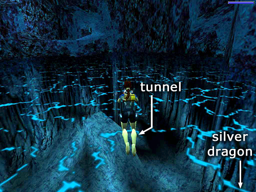 There's a key sitting atop one of the crates on the raft, but unfortunately you can't climb into the raft from the water. So you'll need to make your way to the cavern exit at other end of the lake. First, stop off for a secret: From the ledge with the crates, facing the raft, turn left and swim forward until you come to a tall rock formation sticking out of the water. On the bottom of the lake just below this rock formation there's something shiny amid the seaweed. Dive down to find SECRET #1, the Silver Dragon (9). (screenshots)