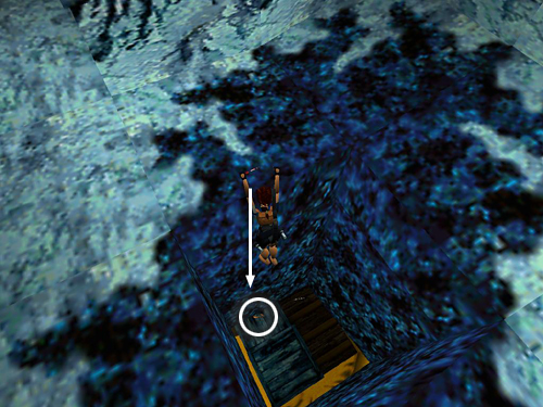 NOTE: In the PS1 version, attempting to safety drop off the edge results in Lara getting skewered on the broken glass. So you'll need to walk to the edge and jump forward instead. Lara will take a small amount of damage from the glass, but she'll survive.