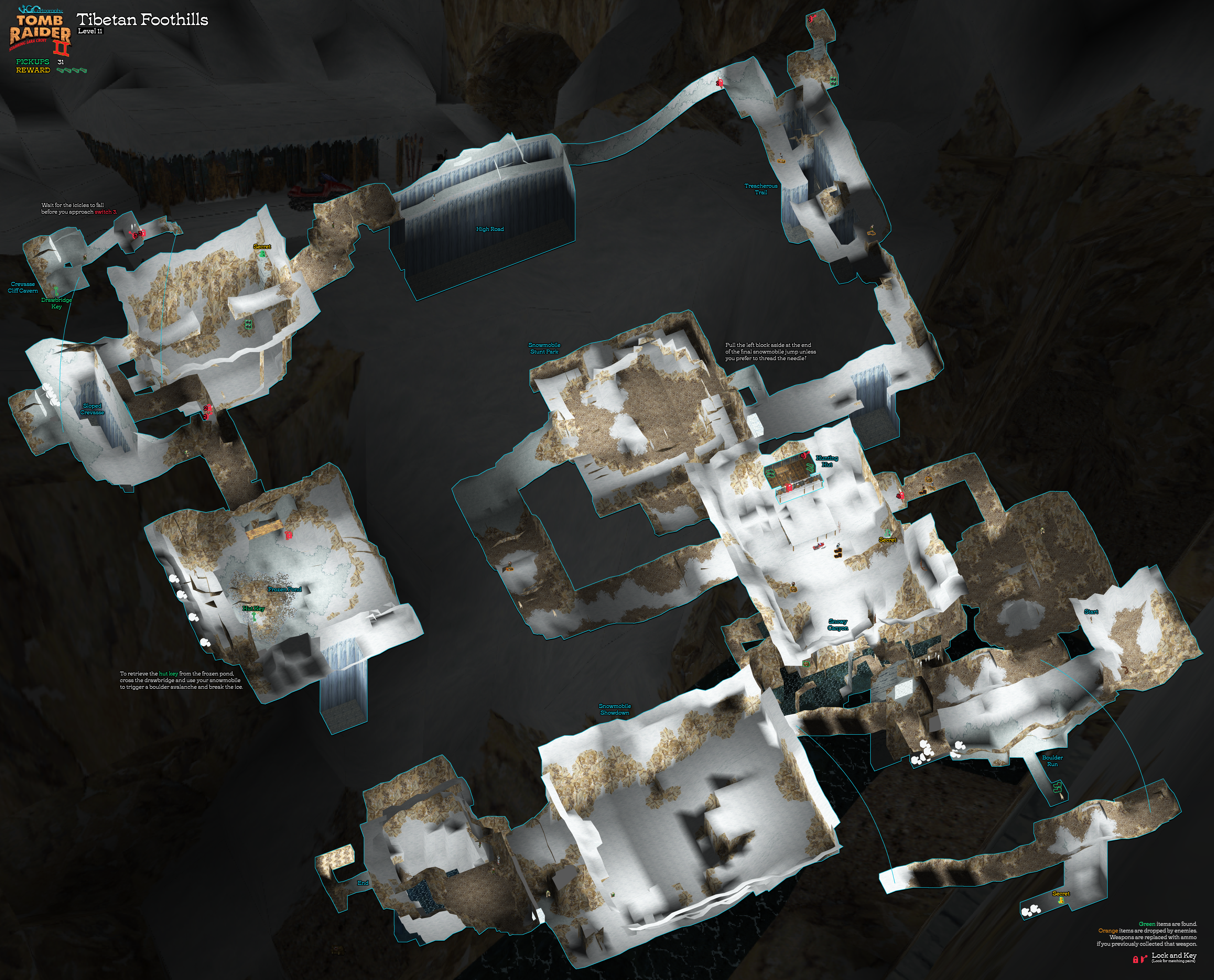 I've also done a separate walkthrough without using snowmobiles: "Tibet on Foot: A Walking Tour." Aside from being a fun way to replay the level once you've beaten it in the usual way, it could come in handy if you lose one or more of the snowmobiles, or if you're attempting the "Eco-Friendly" achievement/trophy in Tomb Raider II Remastered. There's also a Eco-Friendly Tibet on Foot Video walkthrough by Eldincy. (Full remaster updates coming soon-ish.)