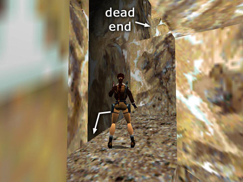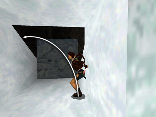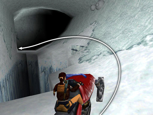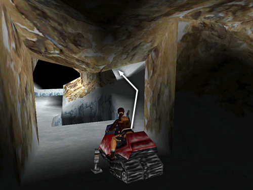 If you can't manage the first tricky jump onto the jagged wall, try this longer route instead. Start in the same position as for the shortcut: facing the ramp in the middle of the clearing with the tunnel and the smaller opening on Lara's left. Drive straight up the ramp, holding Action for a speed boost to jump over the jagged ledge and land in the little cave on the other side. Turn around and drive along the trench beside the jagged ledge toward the tunnel opening. When you reach the corner below the opening, turn left and position the snowmobile squarely facing the snowy ramp ahead. (Save the game here and again each time you make a successful jump. Then if you crash, you can reload and not have to start over from the first ramp.) Use turbo to race up the ramp, jump the gap and land on the ledge in the next corner. Then quickly tap reverse to brake so you don't slide off the other side of the ledge. Now turn left and race the snowmobile forward along the next ledge. Again, hold Action to clear the gap. On the other side, tap reverse to avoid crashing into the wall. Turn left again and use turbo to jump the wide gap in front of the entrance. When you land on the next corner ledge, tap reverse to brake or steer into the right wall so you don't slide off the other side of the ledge. Carefully turn the snowmobile so it's facing the tunnel opening. Race forward along the jagged ledge, holding Action for a speed boost to clear the gap in the ledge, race up the ramp at the end and sail into the tunnel opening. (The long route is shown in another set of screenshots.)
