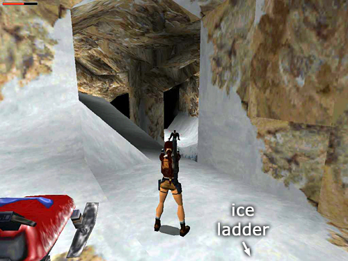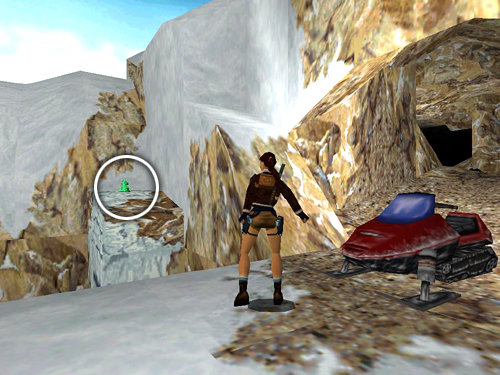 CAVE WITH SNOWMOBILER: Continue to an opening overlooking a large cave. When you drop down to the floor, another guy on a snowmobile (28) drives in from the other side. You can shoot him while dodging or run immediately to the back of the snowy block and climb on top. (screenshot) The snowmobiler can still shoot Lara up there, but at least he can't run her over. Once you've taken care of him, you can steal his snowmobile or continue on foot.