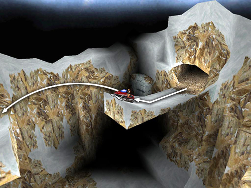 BACK TO THE HUT: From the DRAWBRIDGE area, drive through the dark room with the low ceiling and around the rim of the chasm above where you found the DRAWBRIDGE KEY. Then use the ramps to make the big jump back across the canyon. Continue through the caves and over the narrow ice bridge. At the top of the next hill go through the open wooden gate and turn right. Go forward along the right side of the next chasm, jumping the gap halfway along. When you come to the next wide gap, be sure to use turbo and jump it on the left side. Then continue through the OPEN AREA WITH RAMPS AND LEDGES into the tunnel on the other side.
