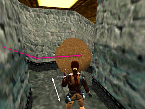 Step down into the small room with gray stone walls. Run past the doorway and wait in the corner for a huge boulder to roll past. (screenshot) Follow the ramp up to a T-intersection. Step forward into the hallway, then quickly hop back to avoid another boulder. (screenshot) Pick up the flares (10) and head up to the left.