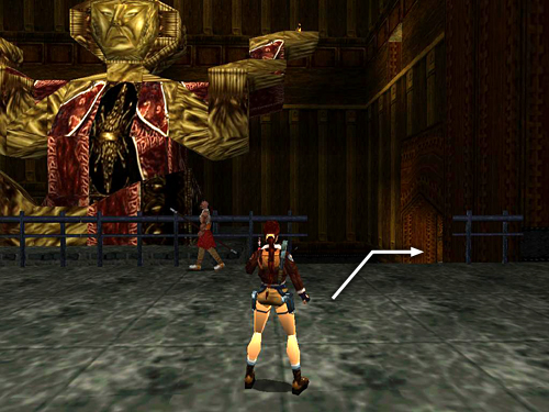 WALKWAY ABOVE MAIN HALL WITH GIANT STATUE: Follow the walkway out to the middle of the room and retrieve the MAIN HALL KEY (9) from the low platform. (screenshot) As long as you haven't attacked his brothers, the monk won't mind. Return to the edge of the room, turn left and continue along the walkway around the corner to the end. The giant statue will then be on Lara's left. (screenshot)
