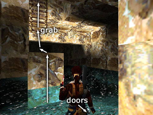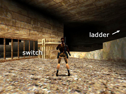 At the bottom of the ladder, turn around and continue through the water into the last cave. The large doors at the far end are closed. Climb up on the block in front of them and take a running jump to grab the bottom of the ladder hanging from the cave ceiling. (screenshot) Climb almost to the top and backflip to land on a ledge behind you. Use the switch to open the big doors below and then drop back into the pool.