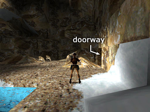 The floor tile just below the doorway contains an invisible pressure pad that closes the door if Lara steps on it. So, to keep the door from closing, walk to the edge of the raised doorway and jump forward to land near the snowballs. Then jump over the snowballs or walk around them to the doorway beyond.