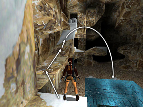 SERIES OF ICY POOLS: Jump up the short slope into a room with an opening over water. Drop through into the pool below. (This is pool is apparently formed by a spring that has been dammed by the ice wall you saw earlier.) Swim to the edge, climb out of the water quickly and kill the 3 fish (26-28) that would try to nibble on Lara.