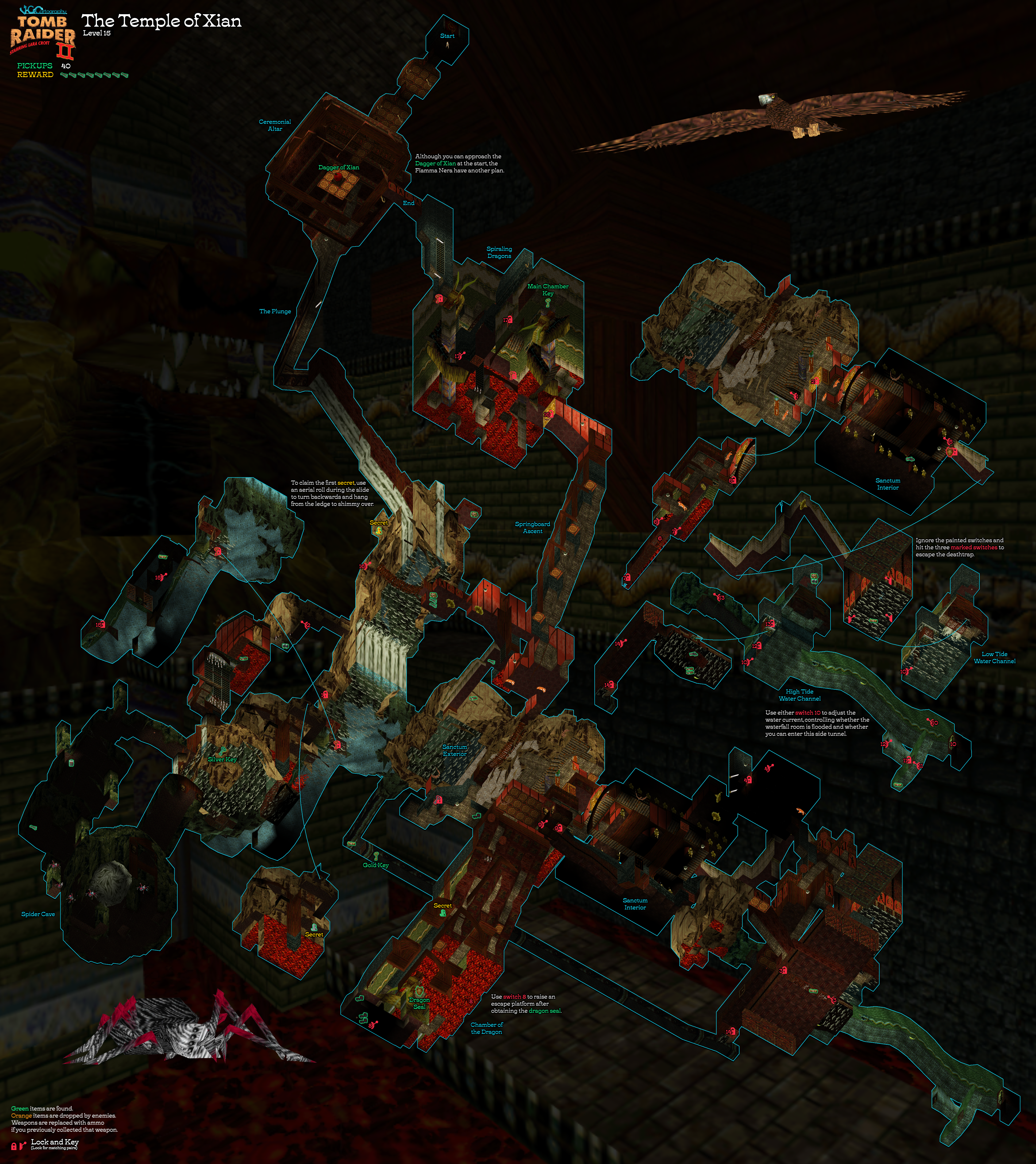 OBJECTIVES: This is another complicated level with lots of side areas and backtracking. From the pool near the start, swim through an underwater tunnel to a cave with two temples with closed doors. Find a secret switch to open a trapdoor back at the pool. Go through this trapdoor and navigate several trappy areas to find the switch that opens one of the temples you saw earlier. Return there and pass through more hazards to reach a large room with a dragon statue, where you'll obtain the Dragon Seal. Escape from this room and return to the first temple, where you can use the seal to open a new area. Explore there to find a Gold Key, which opens the gate in the pool where you started. Swim through the flooded area behind this gate to reach the spider cave, which in turn leads to the Silver Key. This key unlocks the second temple in the cave near the start. Go through the second temple to reach the main chamber. Finally, navigate the traps there to reach the end of the level.