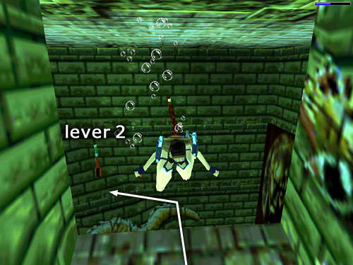 NOTE: After pulling the lever in the small, dark room with the pillars, if you need air quickly, you can also swim out and back up the passage to the left to surface in the pool with the waterfall. Climb out on the ledge with the keyhole and shoot the fish from there. Then swim back down the flooded passage, turn left and then swim up through the trapdoor.