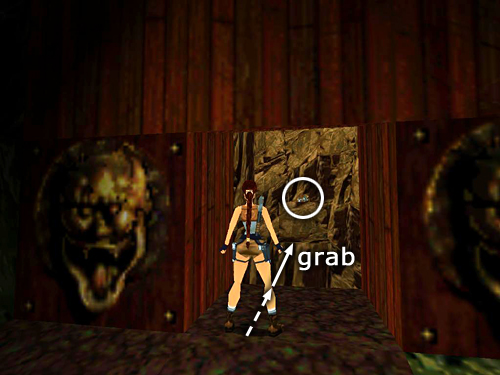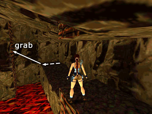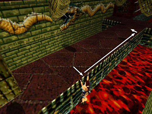 Climb down the block steps along the right wall (i.e., right when facing in the same direction as the dragon) and slide down onto the flat ledge just above the lava. Take a running jump across the lava to the small, square ledge just ahead and another running jump the next small ledge. Turn left to face the short, angled block near the stone pillar supporting the walkway. Carefully set up the next running jump by walking to the edge, hopping back once and then turning just slightly to the left. (This will ensure that Lara lands on the sloping block facing downhill.) Then take the running jump onto the slope and immediately jump again to grab the edge of the taller angled block ahead. Pull up, slide down the back of this block and immediately jump to land on the tall, flat block ahead. Turn right and take a running jump to grab the taller block against the wall. Pull up. (screenshots)