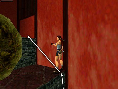 Return to the top of the slope and climb into the opening on the right. Step out onto the wooden bridge and kill the tiger (33) that emerges from the room on the other side, then a bird (34) that flies in from the right when Lara reaches the middle of the bridge. Keep your weapons ready as you enter the red room on the other side of the bridge. There's a second tiger (35) waiting here. When you've dealt with it, climb onto the lower of the two angled pillars and backflip to land on the higher pillar. Turn around and jump to the flat ledge ahead. Climb onto the red ledge on the left. (On the right is a STEEP SLOPE WITH TIERED SPRINGBOARDS. The doors at the top are closed now, so don't bother going up there yet.) Beyond the red ledge is a room with a rolling blade moving back and forth along a ledge.
