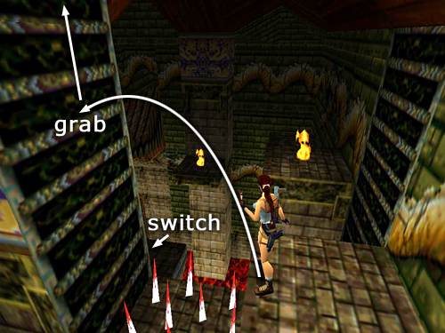 SMALL ROOM WITH SPIKES AND CLIMBABLE WALL: Drop into the room and either go around the spike pit to grab onto the wall of ladders or take a running jump across the spikes to grab on. Climb until a horizontal crevice prevents you from going any farther. Traverse to the right so Lara is hanging below the flat part of the ledge above and not the spikes. Then backflip onto the slope behind and immediately jump forward to land on the flat spot above where you were just hanging. (screenshot)
