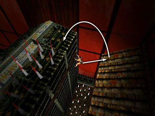 SPIKED WALL TRAP ROOM: Do not rush into the alcove ahead. The switch there is a decoy. No matter how you approach it, the floor collapses and you slide into the room below, where spiked walls begin to encroach. Grabbing the small medi pack (8) on the floor and getting out alive is a challenge, but it's possible. Position Lara in the middle of the doorway and run onto the collapsing floor. Don't press any other controls as she slides down the chute. When she lands, she should be positioned in the middle of the walkway with the medi pack and the skeletons. Jump forward and press Action. Lara should land right on the medi pack and pick it up without hesitation. As soon as she stands up again, jump forward, run to the real switch and pull it to open the exit, which is directly behind her. Immediately do a backflip with a mid-air twist (Jump + Back + Roll in rapid succession). Lara should land facing the exit. Take a running jump, then keep running through the door. (screenshots)