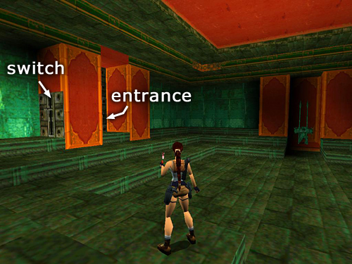 In order to get to the next room, you must awaken the third and fourth spearmen (3-4). Locate the second switch to the left of the entrance. (screenshot) Pull it to open the exit and animate the guardians. Destroy them and then advance carefully into the next room.
