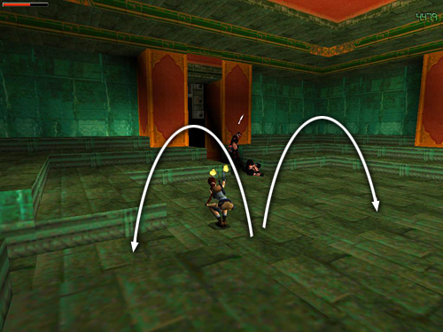 DARK ANTEROOM WITH MANY PILLARS: There are 6 cult members (6-10) lurking among the pillars. You can draw them out two at a time by advancing slowly into the room with weapons drawn. As soon as the first two emerge from hiding, back out of the room and jump from side to side while firing to avoid their throwing daggers. (screenshot) Uzis work well here, and you'll have a chance to pick up more ammo afterward. Repeat the same strategy for the next pair of enemies. For the last two, advance farther into the room and fight them as they appear. When they're all dead, recover their stuff: large and small medi packs, 6 sets of Uzi clips (4-11), and a MYSTIC PLAQUE (12). Use the Plaque in the receptacle beside the gate to open it. Go through, follow the hallway to a short ramp and slide down into the Dragon's Lair.