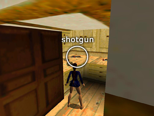 The front door is standing open, and 2 more dogs and 3 more men (7-11) are waiting outside. You can draw them to you by stepping outside just beyond the doorway then hopping back into the house. They'll enter a few at a time. First come 2 men with guns and 2 dogs (7-10). If you move back from the door, you can take them out while side-flipping back and forth to avoid taking too much damage. Shortly after this, another thug with a gun (11). One of them drops a small medi pack (44). If you wait in the MAIN HALL for a few more minutes, 2 more bad guys with bats (12-13) will come through the door and you can shoot them, or go outside and hunt them down.