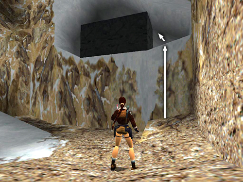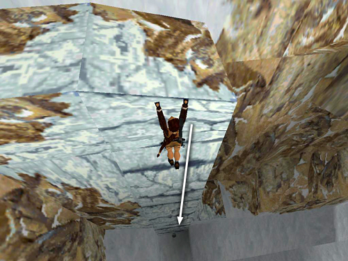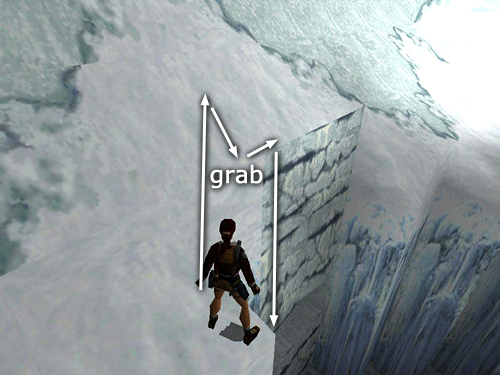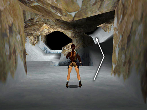 CAVES AND NARROW ICE BRIDGE: Continue through the tunnel until you reach a wide gap. This next jump is a bit tricky so save the game before attempting it. Move to the right side of the gap and set up the jump carefully: Walk to the edge and then hop back once. Take the running jump and press Action at the last minute while Lara is in the air to grab the opposite ledge. (screenshot) Pull up and keep walking.