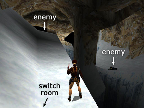 Soon you'll come to an area with a chasm in the center and a ledge on each side. Go to the right, following the ledge to a dead end. (screenshot) Climb the ice ladder and pull the switch to open a gate on the other side of the chasm. Climb back down, take out the 2 enemies here. (screenshot) Then return along the ledge, make a U-turn near the cave entrance and follow the wider ledge along the other side of the chasm, using a simple running jump to clear the gap. Go through the gate you just opened, head down a ramp through a tunnel then over a narrow ice bridge, where you'll meet another bad guy. After crossing this bridge, continue through the next dark tunnel, killing 2 more enemies on the way.