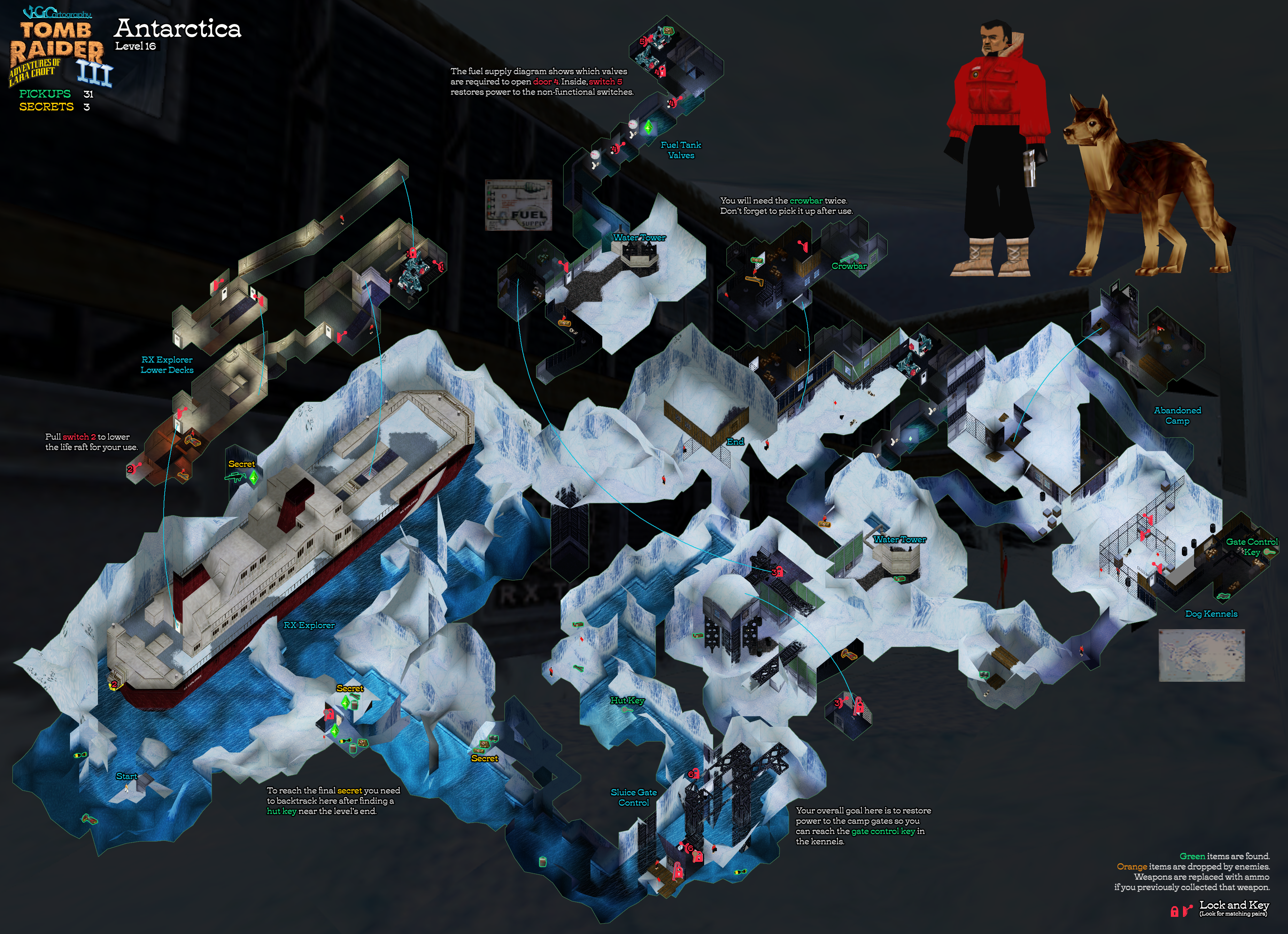 Secrets: 3 Pickups: 31, including a CROWBAR and 2 keys Kills: 30 Save/power-up Crystals: 4