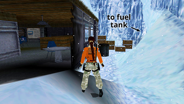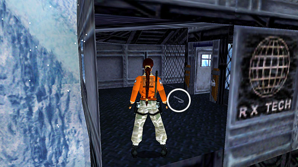 NOTE: If you're missing the key or the crowbar, you'll need to go back for them now. You probably left the crowbar in the TOWER WITH THE RX-TECH LOGO after Lara last used it. Monkey swing across the water and follow the tunnel back to the compound. The tower is just ahead on the left. Climb up into it and you should find the crowbar lying on the floor next to the door you pried open earlier. (screenshot) If you missed the key, from the TOWER area, go through the dark passageway to the FUEL TANK. Then follow the snowy tunnel on the right, cross the WOODEN BRIDGE ABOVE THE PIT, and continue to the KENNEL. Enter the building to find the key, as described above. Then return to the GATEHOUSE. The RX-TECH COMPOUND MAP may also help.