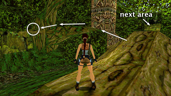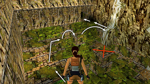 NOTE: It's possible to avoid the tigers entirely by crossing the area on top of the pillars. The path is shown in this screenshot. In the picture Lara is standing on the ledge with the save crystal. If you never touch the pillar on the right (marked with the orange X) or the floor, the tigers never appear and you don't have to fight them.>