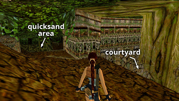 To reach the courtyard we want to explore next, drop down from the wall into the muddy area where you found the last crystal. Then climb back onto the ledge at the base of the big slope and drop down on the left. Or, move to the corner of the ruined building and either take a standing jump into the doorway or slog through the quicksand and pull up into the doorway. (screenshot)