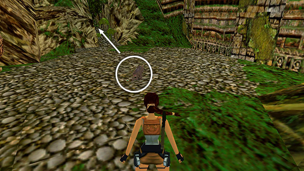 Go around the tree where you found the flares. You may spot a monkey (14) here making off with a small medi pack (26), but don't chase after it. Notice the archway concealed by broad, green leaves at the top of the hill. This is another boulder trap. Keeping that archway on your left, walk forward up the brown slope toward the next two big trees to trigger the first of 3 boulders. As long as you advance slowly, the boulder should roll to a stop harmlessly in front of Lara. Approach the boulder where it landed, turn left, and walk up the brown part of the hill (not the green section farther to the right). As long as you stick to the brown area, the second boulder will roll past on Lara's right, not coming anywhere near her. Continue walking up the slope as far as Lara will go. Then take a standing jump up the steeper section to land inside the wall of greenery. This triggers the third boulder, which rolls past on Lara's right. It lands at the bottom of the hill near the other two. (screenshots)