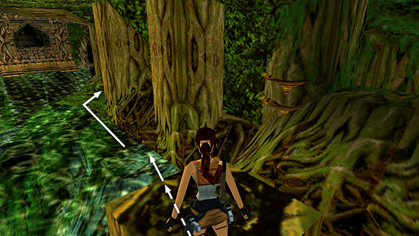 From the spot where the shells were, walk up the low rise, position Lara near the right edge, and take a standing jump to leap over the leafy branches and land on solid ground at the left side of the base of the big tree. You may need to press the Left direction key to veer left while in the air in order to nail the landing. Then use a series of standing jumps to get up behind the tree. This is SECRET #2—shotgun shells (5) and a save/power-up crystal (1). (screenshots)