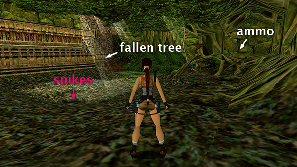 MISTY AREA WITH SPIKE PIT: Climb onto the block at the entrance. (In the demo, there is a small medi pack on the ground to the right.) Continue forward to the far right corner, where you'll find some shotgun shells and Uzi clips (15-16). (screenshot) In the misty area in the middle of the clearing is a pit with spikes at the bottom. Avoid it for now. Instead, head to the far corner of the building and crawl through the low tunnel under the huge, fallen tree. A friendly monkey (8) will show you the way.