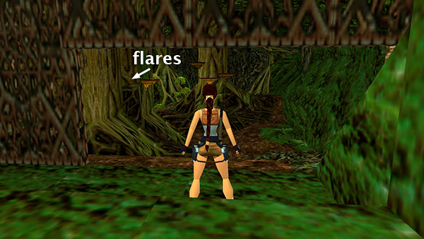 MORE DENSE JUNGLE AND TRIPLE BOULDER TRAP: Go down the wide, green steps and through the gate you just opened. A little way in on the left is a tree with ledge cut into it, where you can pick up some flares (25). (screenshot)