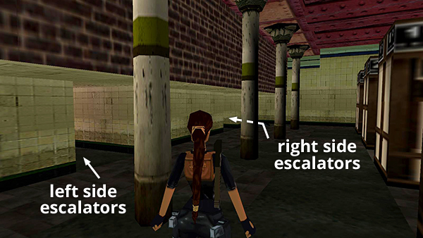 RIGHT SIDE ESCALATORS AND MAINTENANCE ROOM: Go through one of the two doorways on the right and down either escalator, but mind the gap! To cross the dirt-rimmed pit, take a running jump on the right side, just beyond the bottom of the escalator, and aim straight for the opposite edge of the pit. If you try to jump across the left side of the pit, Lara will bang her head on the low ceiling. If you land too far to the right on the brown slope, Lara will slide back into the pit. (screenshots)