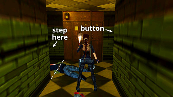 THREE TIMED DOORS: If you like you can press both buttons to see which doors they open. You may also want to scout ahead to check the layout of the room you'll need to run through. Then return to the buttons and save your game before starting the first timed run. The sequence is shown in a series of screenshots as well as a short video walkthrough.