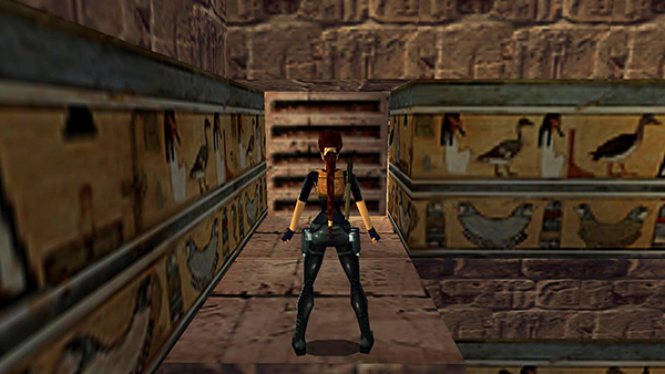 EGYPTIAN EXHIBIT WITH PAINTED MURALS AND CARVED LEDGES: Go around to the back of the room to get a small medi pack (8) sitting on a ledge. Then climb the stepped blocks in the middle of the room. Notice the doorway with the wooden ladders above and below it. Climb up into this opening. Enter the little room on the left. Go behind the carved block and push it onto the gray tile in front of the doorway. This will return the tall pillar outside to its original position near the entrance. Climb into the crawlspace above the movable block and drop down on the other side. (screenshots)
