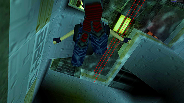 Move into the middle of the room, where the ceiling is a little higher, and take a standing jump over the laser beam to reach the save/power-up crystal (3) . Jump back over the laser, drop down through the hole onto the stairs, move down to the lowest step, and then safety drop to the floor, losing a smidgen of health in the fall. Alternatively, if you're really trying to conserve health, you can monkey swing back to the ledge above the MJ-12 box and then drop down. (screenshots)