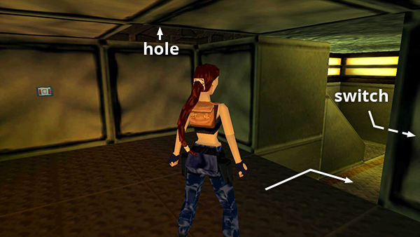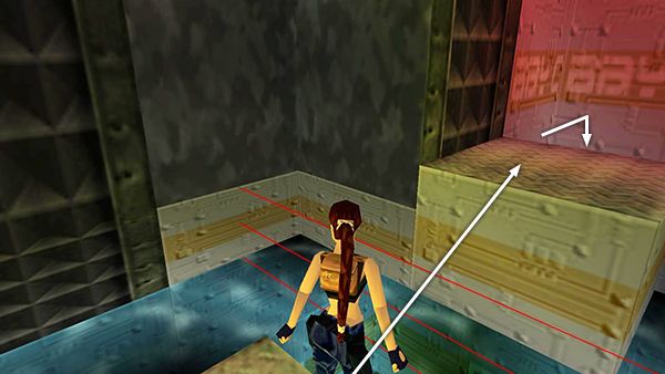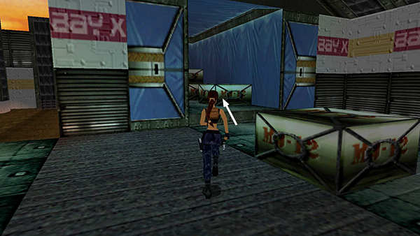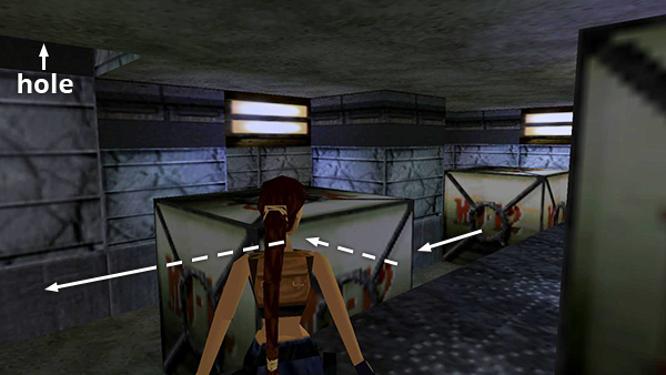 Turn around and go back to the second box. Pull it twice (from B2 to B3). Now return through the crawlspace to the passageway behind the first box. Turn left and proceed to the dead end where the second box was to find SECRET #1, a small medi pack (1). Then climb up through the hole in the ceiling onto the walkway above.