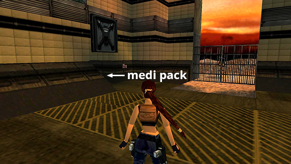 OUTDOOR AREA AND CONTROL ROOM: Go out into the open area at the top of the ramp. In a small room to the left of the gate, where the last two MPs came from, you'll find a large medi pack (28). (screenshot)